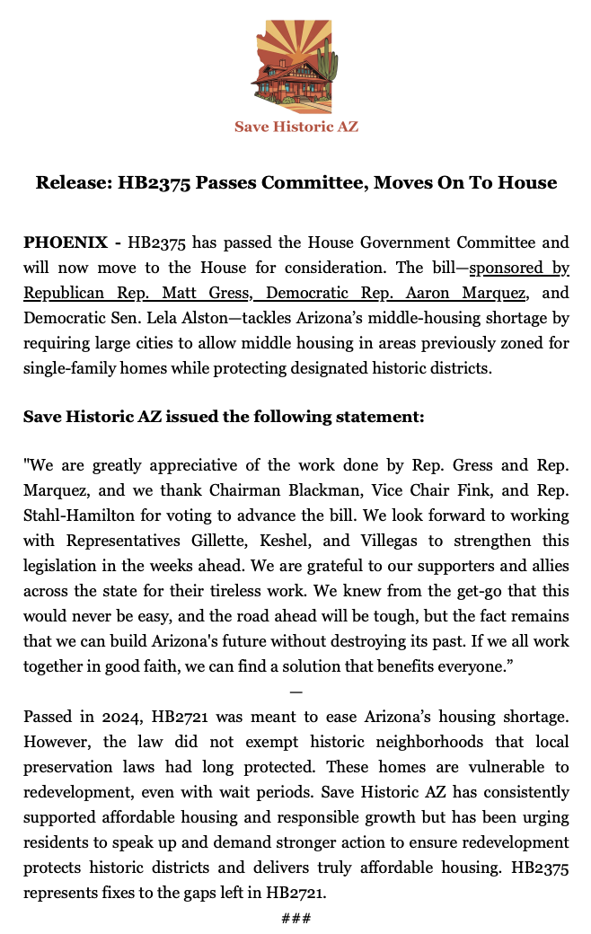 Passed in 2024, HB2721 was meant to ease Arizona’s housing shortage. However, the law did not exempt historic neighborhoods that local preservation laws had long protected. These homes are vulnerable to redevelopment, even with wait periods. Save Historic AZ has consistently supported affordable housing and responsible growth, but has been urging residents to speak up and demand stronger action to ensure redevelopment protects historic districts and delivers truly affordable housing. HB2375 represents fixes to the gaps left in HB2721.